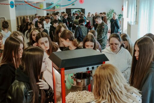 Na chwilę szkoła przestała być szkołą, a zaczęła przypominać konkretny festiwal energii, pomysłów i akcji. Zapach pysznego popcornu serwowany przez naszą panią sekretarz Paulinę Radziszewską mmmmy poezja