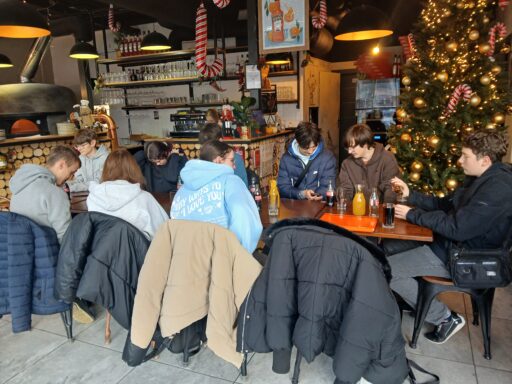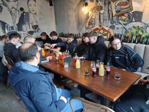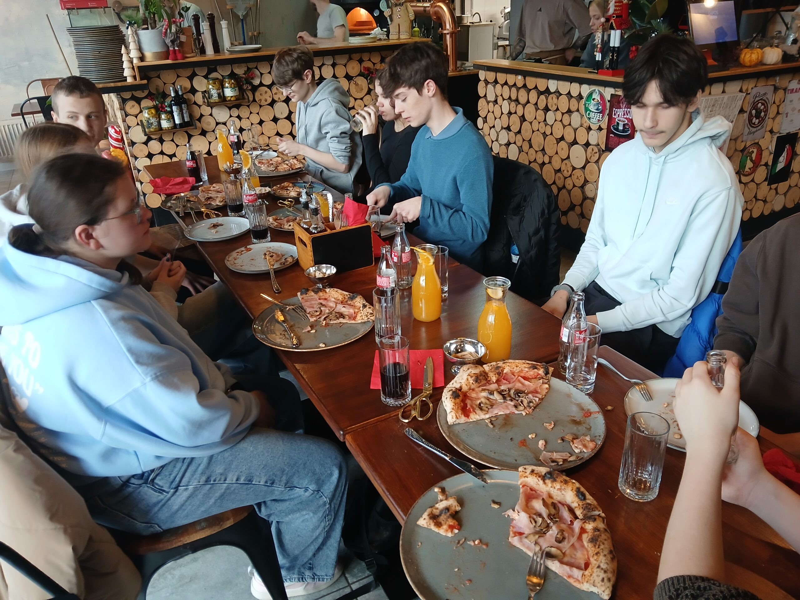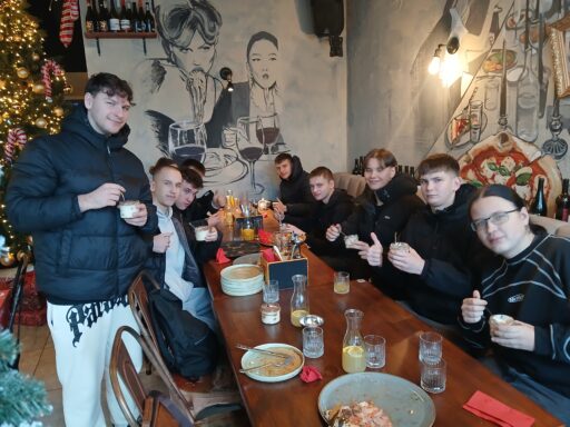 Nie zabrakło też chwili na regenerację. W trakcie wycieczki był czas na wspólny posiłek – pizza w dwóch wariantach do wyboru, napoje oraz pyszny deser tiramisu, który zniknął w mgnieniu oka.